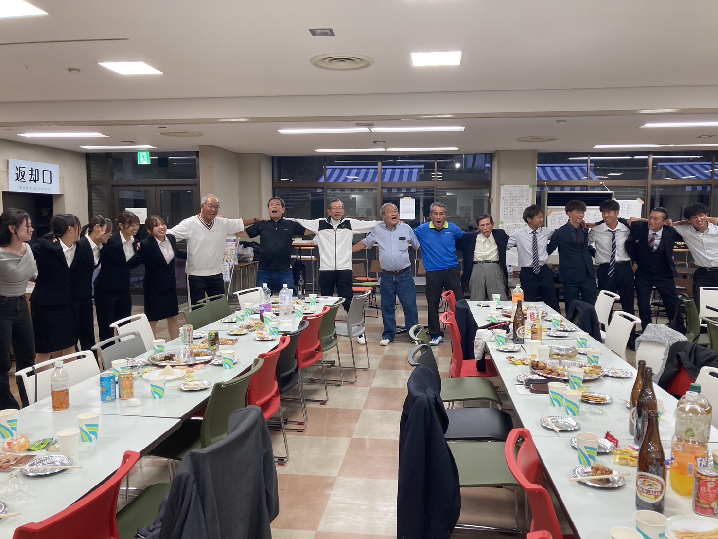 引き続き行われた懇親会では,各テーブルで食事をとりながら現役とOB・OGの交流が図られ,その合間に現役とOB・OG諸氏から自己紹介や近況報告が行われ,また学部16回の音田先輩による思い出話などで大いに盛り上がりました。最後に全員が肩を組んで恒例となった学歌,応援歌を斉唱し,エールで締め括りました(終了時間は17時30分)。本当に楽しい一日になりました。