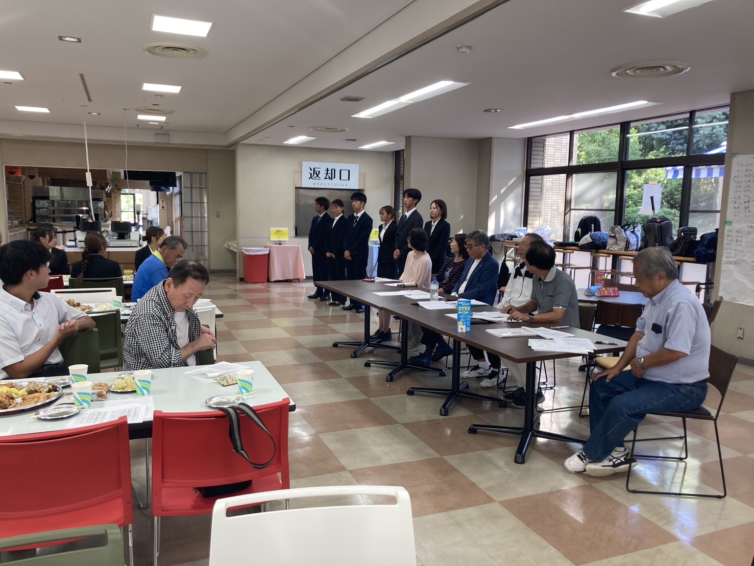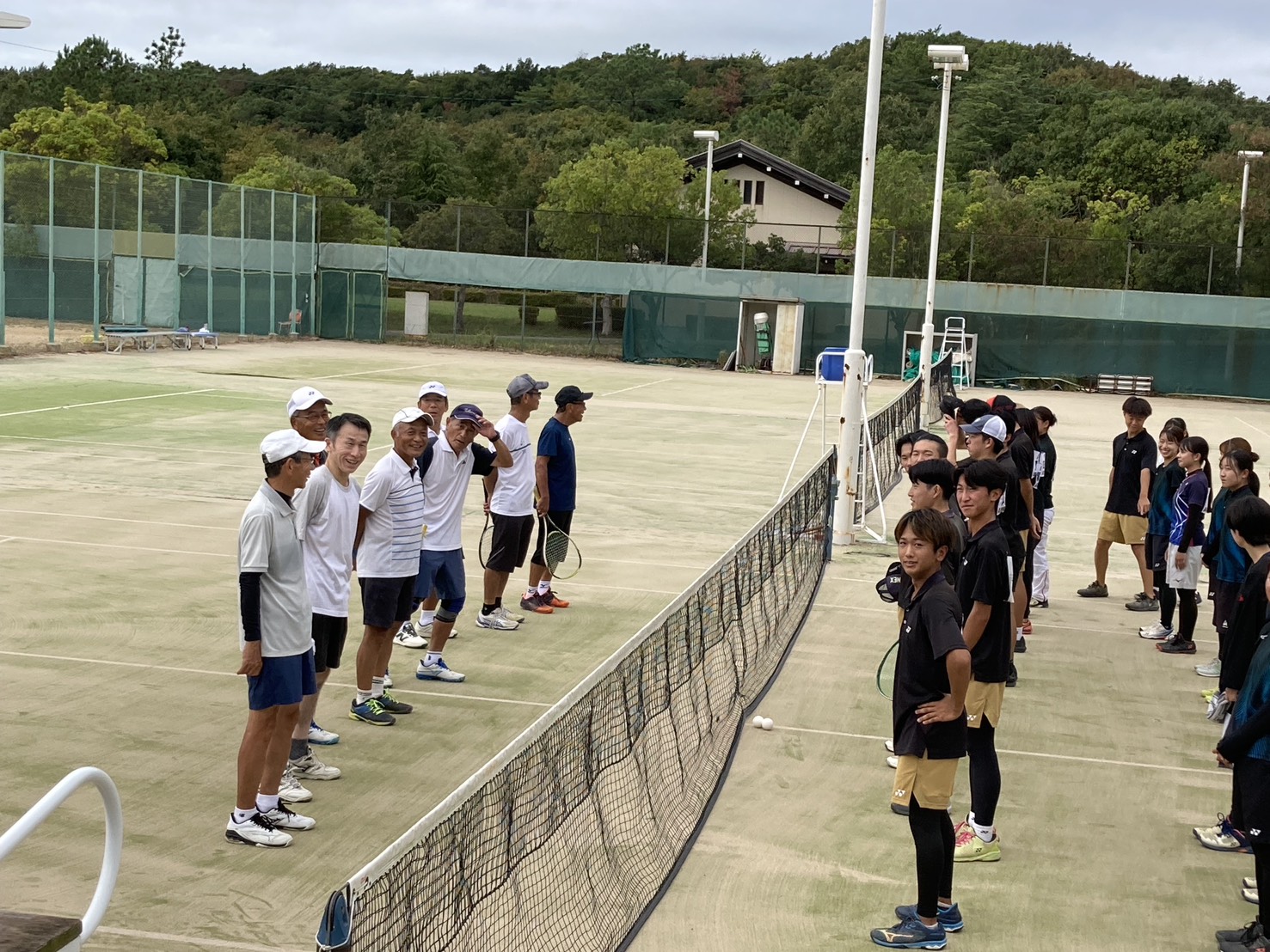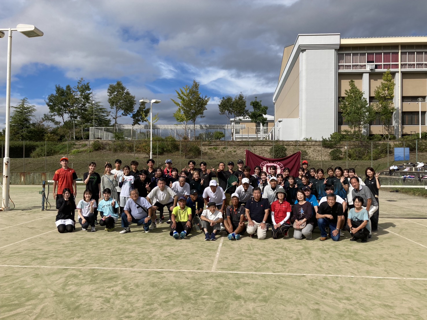 令和7年10月11日(土),現役・OB交歓会(テニス・対抗試合,OB総会,懇親会)が今年も母校(学園都市キャンパス)にて開催され,盛会裏に終えることができました。9時半の集合時間には軽い通り雨に遭いましたがその後は天候に恵まれ、良い水まきになったねと冗談を言いながら、10時前からはテニスコートで現役とOB・OG諸氏がラケットを握り,楽しそうに汗を流しました。現役との対抗試合(OB年配者は現役女子部と対戦)も行われ,最近は例年のことですが現役に軍配が上がりました。